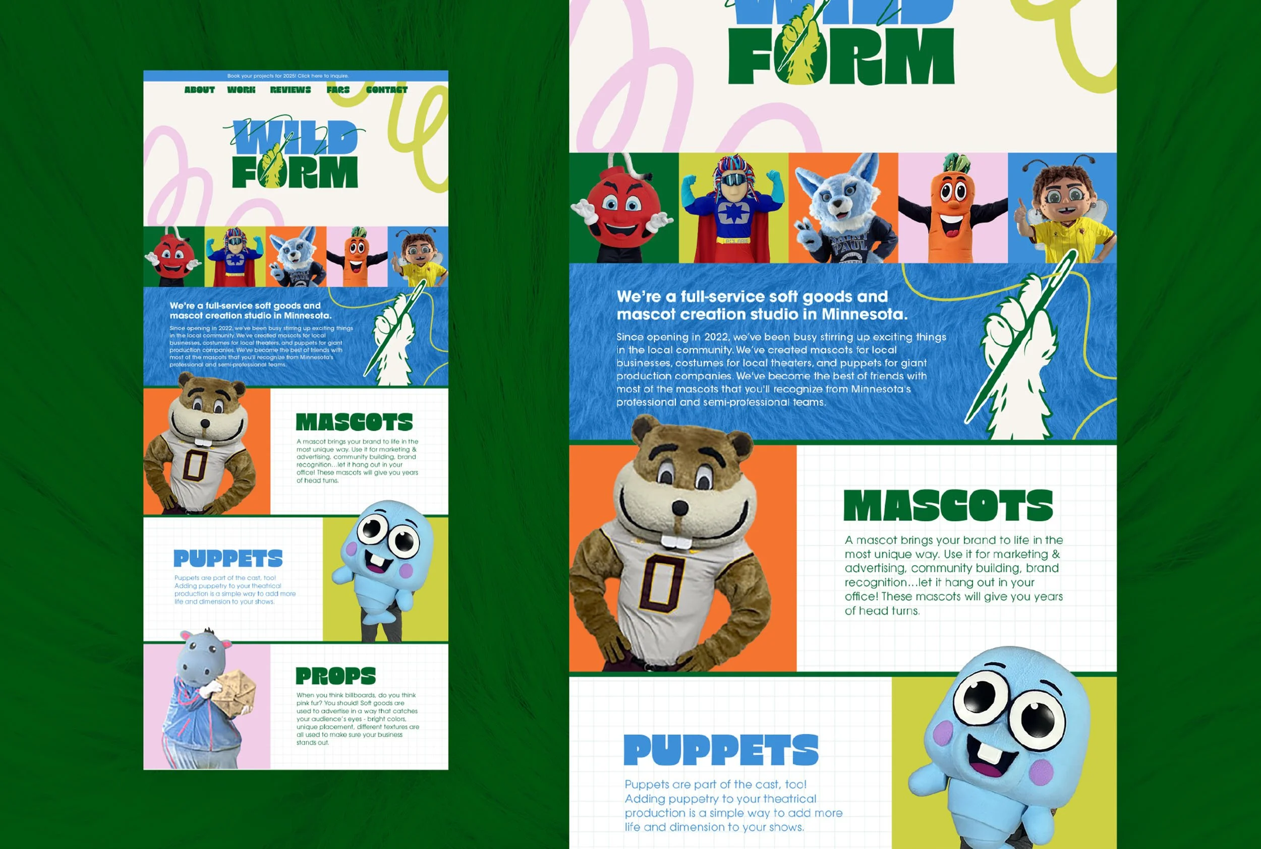 WildForm | 2025 | Branding designed at Spot for WildForm Studios, a custom mascot and character fabrication studio serving entertainment brands, theme parks, and live productions. The project focused on elevating the brand to better reflect the craftsmanship, scale, and personality of their work, while still capturing the energy and joy that define what they create. I led creative direction and developed the visual system, brand guidelines, and supporting digital assets.